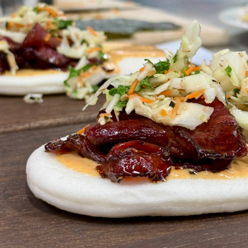 - Bao Buns nach Packungsanweisung im Dampfgarer oder Bambuskorb 6–8 Minuten dämpfen, bis sie weich und fluffig sind. Warm halten.